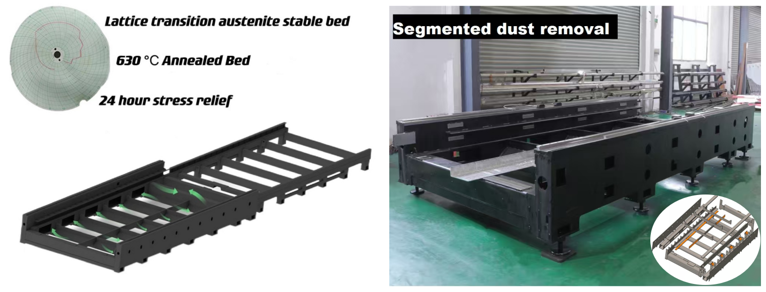 The machine is equipped with an internationally renowned laser source, and it features a mobile gantry structure and an overall surrounding enclosure that facilitates efficient smoke and dust removal during cutting. This ensures long-lasting stability, safety, and environmental friendliness.